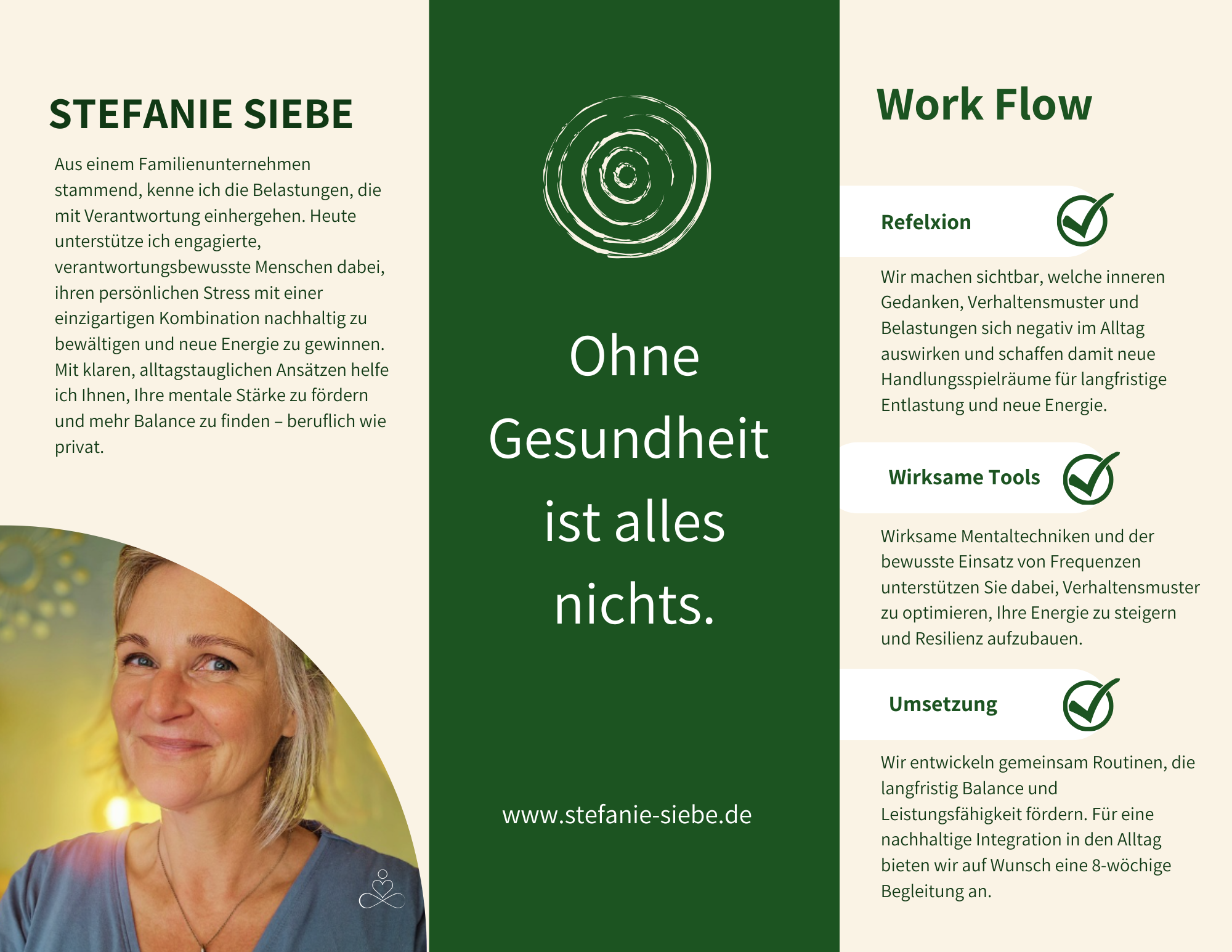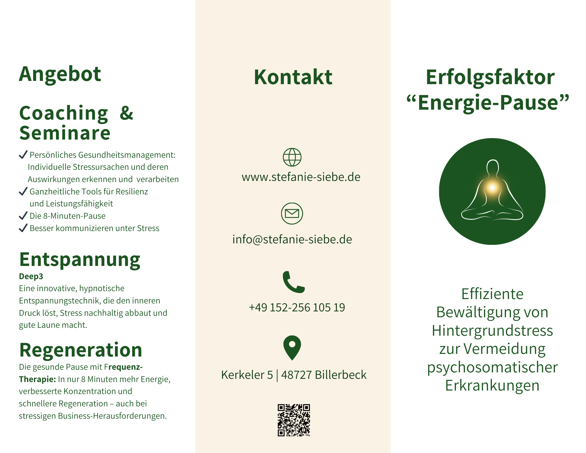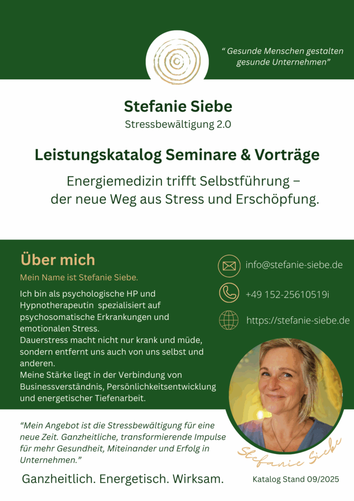 Mein Leistungskatalog bringt frische Impulse in ein bekanntes Thema – durch die Verbindung von bewährten Konzepten mit Körperbewusstsein, emotionaler Regulation, Energiearbeit und Selbstsuggestion.